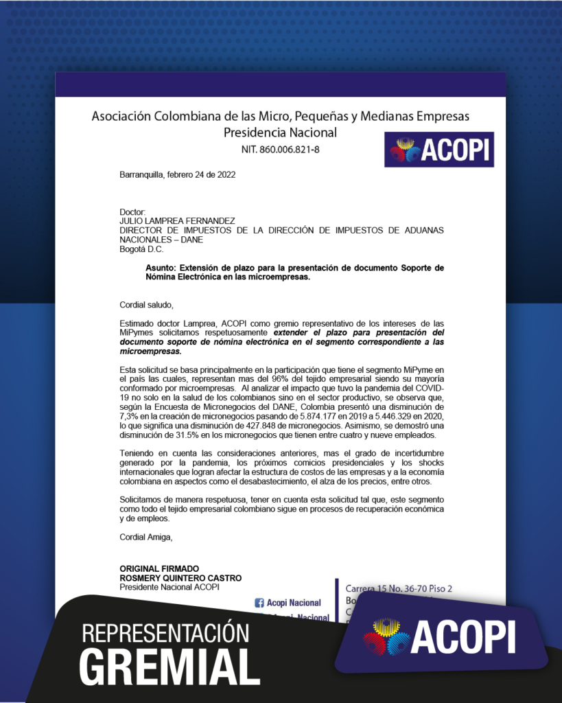 Gracias a solicitud de ACOPI, DIAN modificó fecha de implementación para el documento soporte de pago de nómina electrónica para empresas de hasta 10 trabajadores
